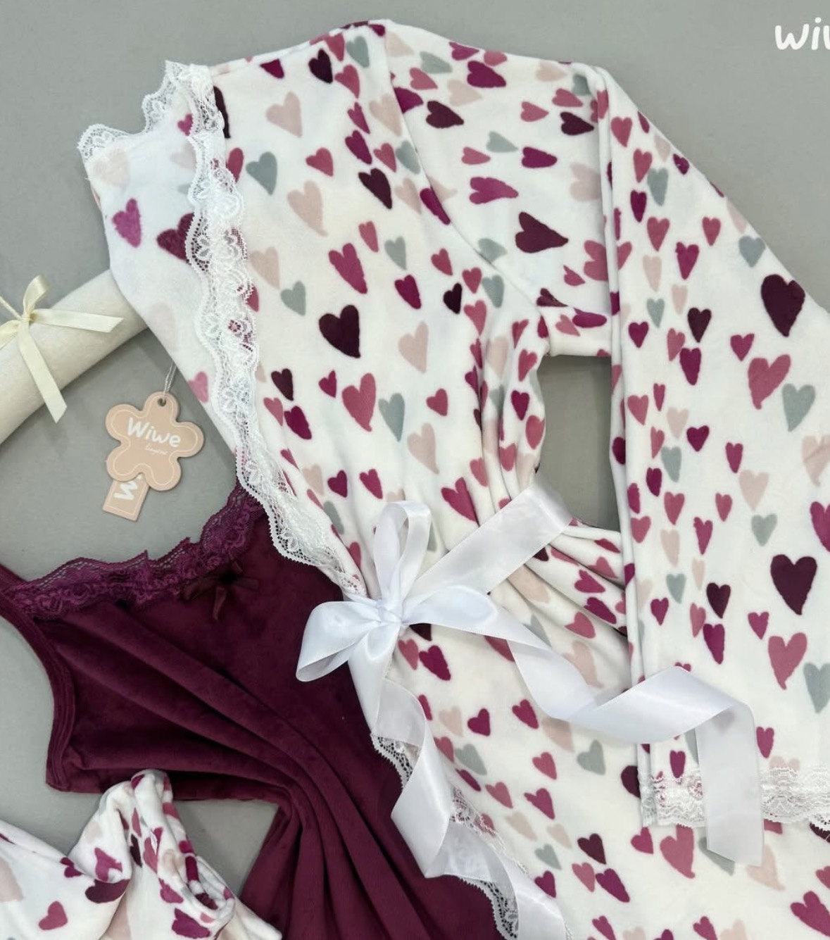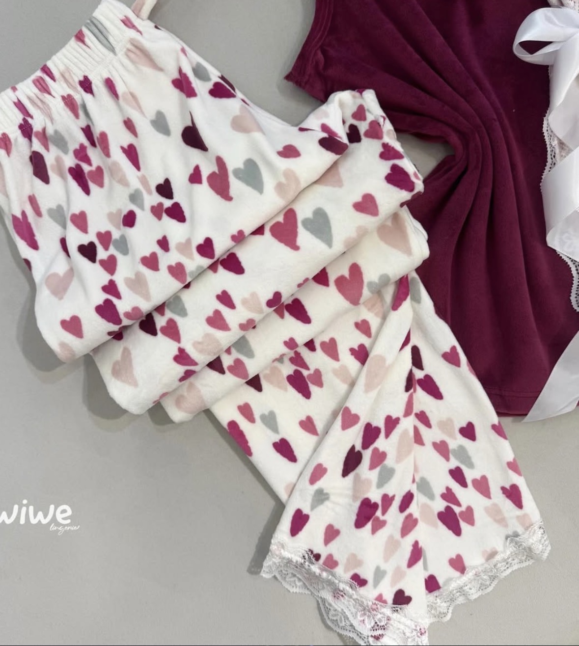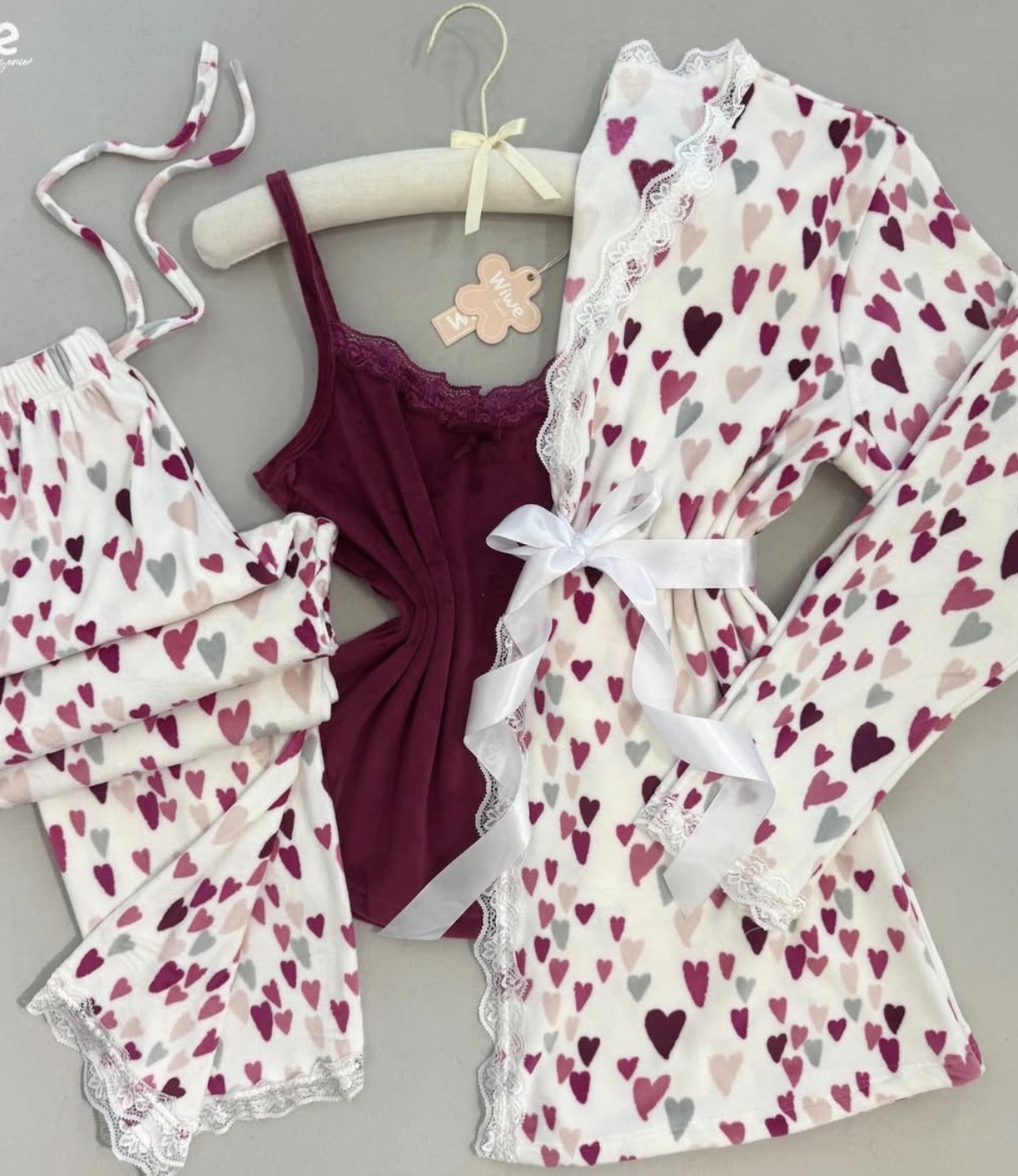 بيجامة قلوب باللون الزهر والأبيض ٣ قطع