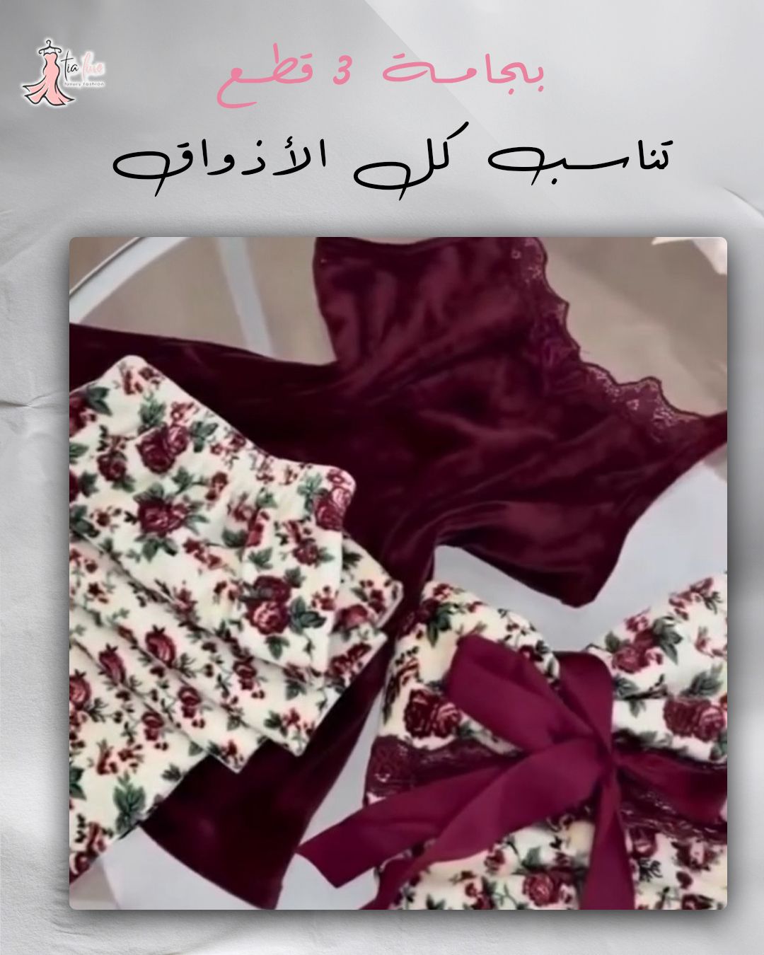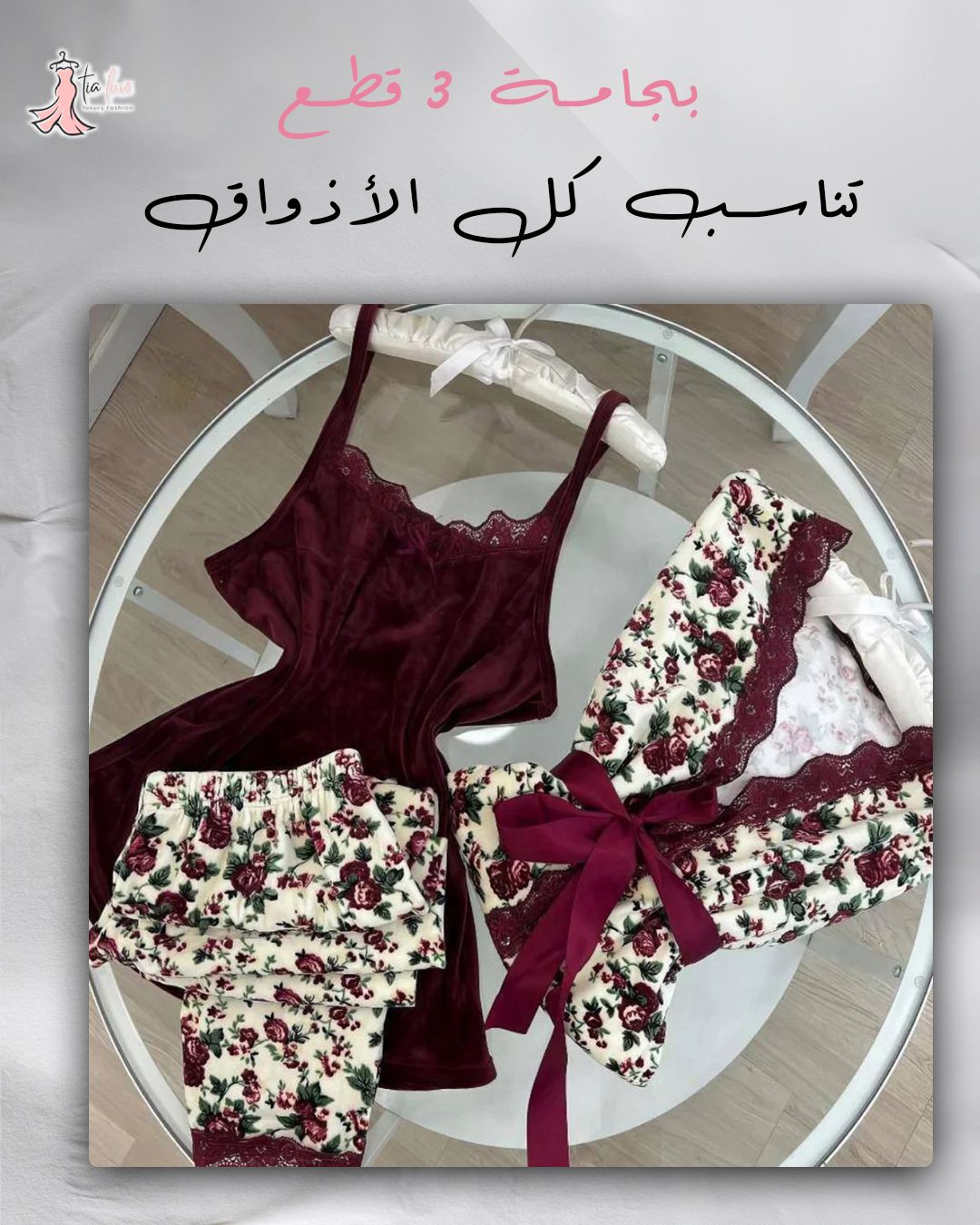 بيجامه ٣ قطع باللون البرغندي مزين باللورد